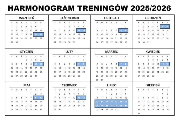 Treningi odbywają się w formie zjazdów weekendowych – raz w miesiącu, 3 godziny dziennie. Sobota 14:00, niedziela 10:00. Dodatkowo raz w roku, w lipcu organizujemy dwutygodniowy obóz letni.